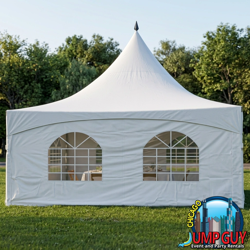 The High Peak Frame Tent’s distinctive center peak creates an elevated visual profile that photographs significantly better than flat-roof configurations and reads as a deliberate design choice rather than functional weather protection, the right choice for Lake Forest outdoor events where the tent is part of the aesthetic. Consistently the preferred configuration for private celebrations on the wooded estate properties near Forest Park Beach and for gatherings near the Market Square historic district where the outdoor setting calls for a structure that complements the distinguished architecture of the neighborhood. Side walls at $50 per panel. Full crew setup and breakdown. Delivers to Highland Park and Lake Bluff within the standard service zone.